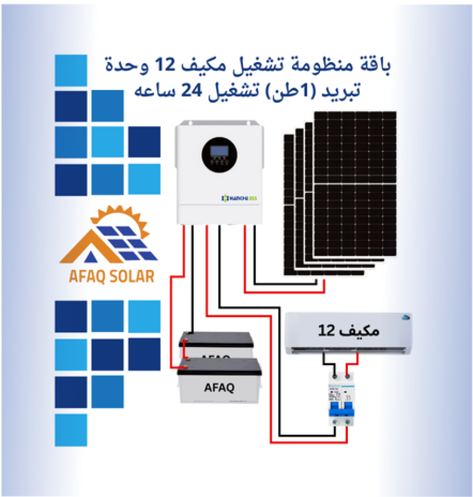 مع افاق الأحترافية نقدم لك منظومة طاقة شمسية جاهزة لتشغيل مكيف سبلت 12 وحدة تشغيل 24 ساعة وحدة بالإضافة الى اجهزة منزلية اخرى مثل الأنارة .
